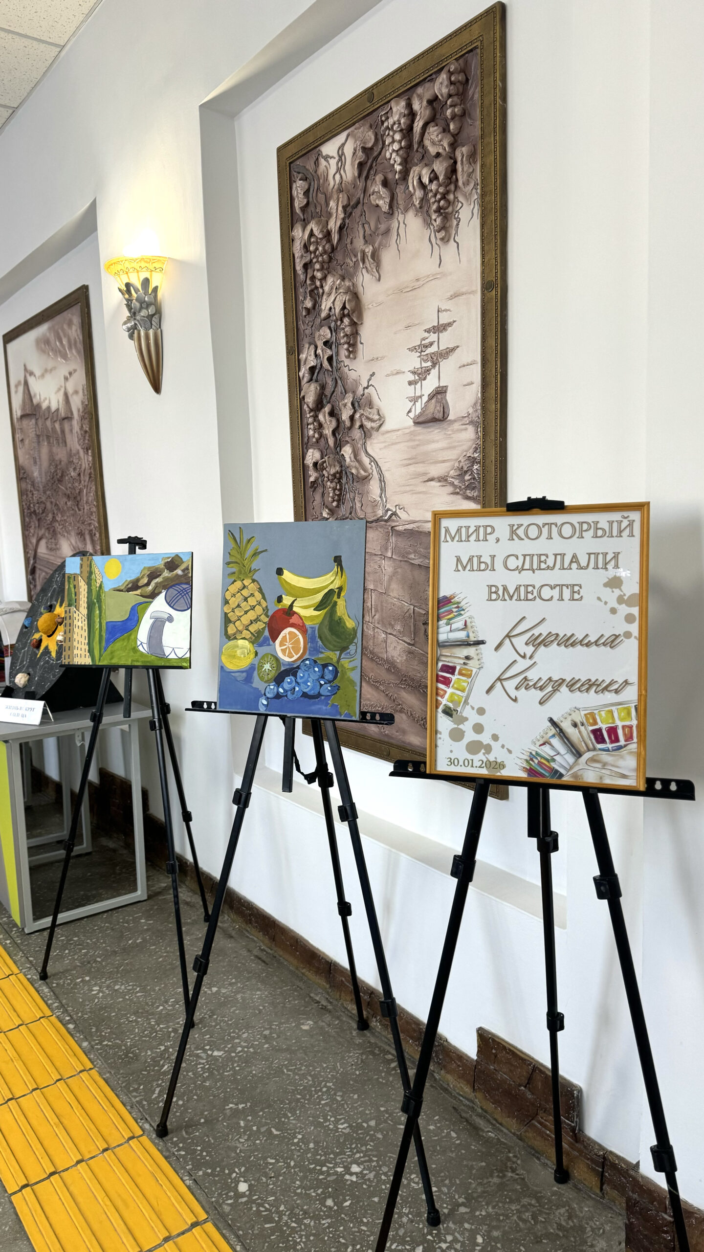 Экспозиция посвящена художественным произведениям юного автора — ученика 6 «Б» класса нашей школы Колодченко Кирилла, созданным в тесном творческом союзе с его мамой — Дианой Юрьевной. Это не просто выставка работ ребёнка, а глубокая и трогательная история о семье, поддержке и совместном пути к творческому самовыражению.