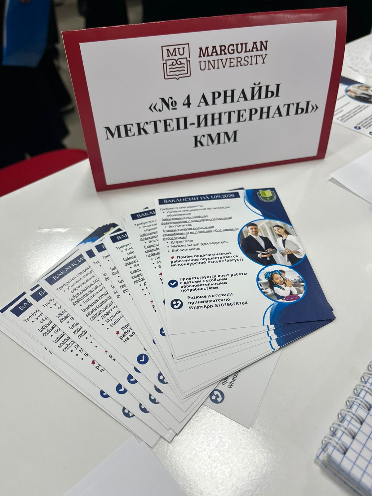 Сегодня представители школы-интерната приняли участие в ярмарке вакансий, организованной в НАО «Павлодарский педагогический университет имени Әлкей Марғұлан». Мероприятие стало эффективной площадкой для профессионального диалога, знакомства с выпускниками и привлечения перспективных кадров в сферу специального образования.